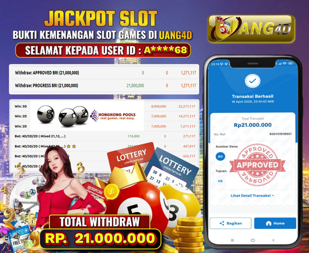 UANG4D dikenal sebagai situs terpercaya yang selalu menghadirkan pengalaman bermain slot online yang aman, fair, dan berlisensi resmi. Di sini, kami tidak hanya sekadar memberikan janji, tapi bukti nyata berupa slip kemenangan yang dapat Anda lihat secara langsung.