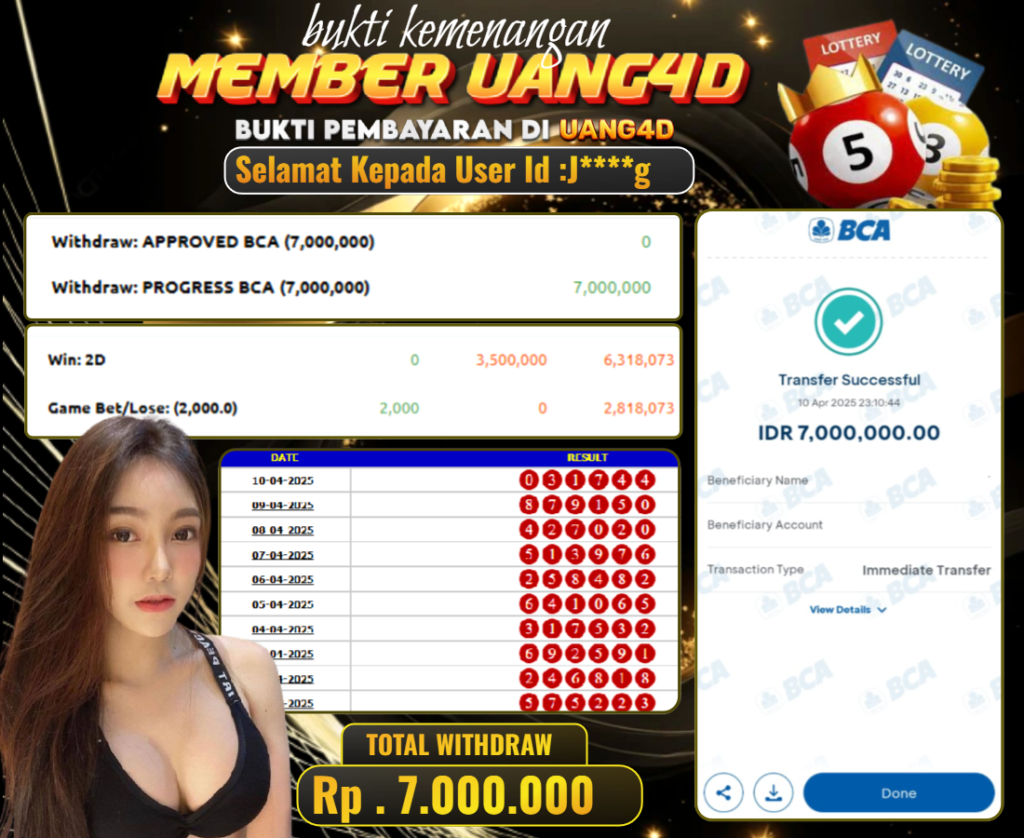 UANG4D dikenal sebagai situs terpercaya yang selalu menghadirkan pengalaman bermain slot online yang aman, fair, dan berlisensi resmi. Di sini, kami tidak hanya sekadar memberikan janji, tapi bukti nyata berupa slip kemenangan yang dapat Anda lihat secara langsung.