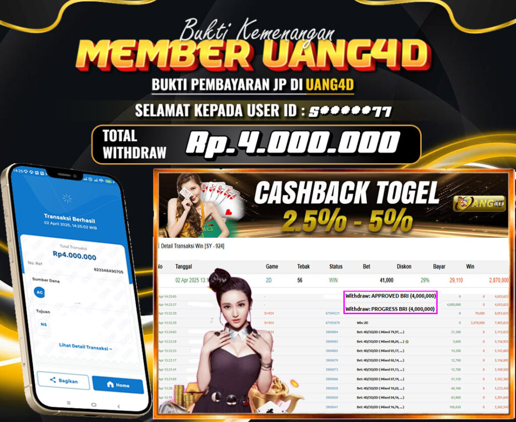 UANG4D dikenal sebagai situs terpercaya yang selalu menghadirkan pengalaman bermain slot online yang aman, fair, dan berlisensi resmi. Di sini, kami tidak hanya sekadar memberikan janji, tapi bukti nyata berupa slip kemenangan yang dapat Anda lihat secara langsung.